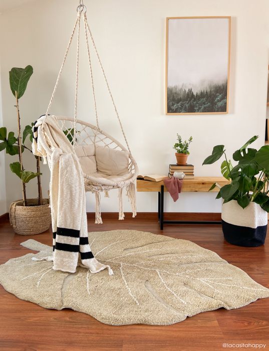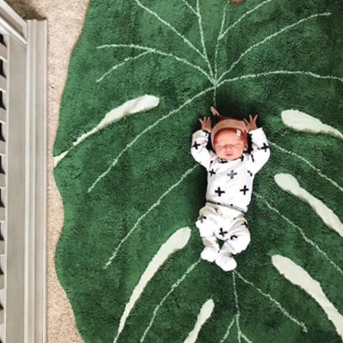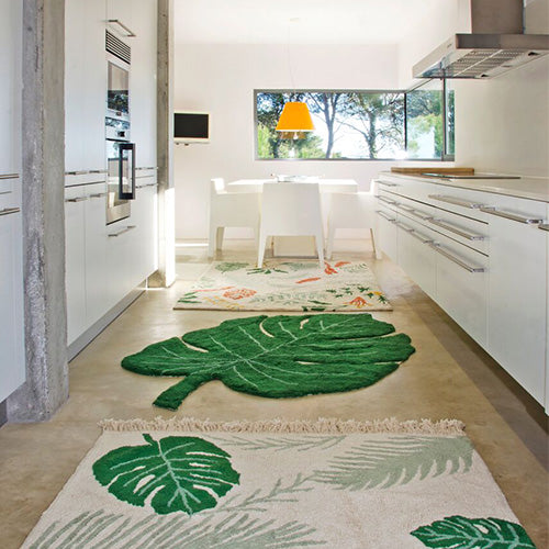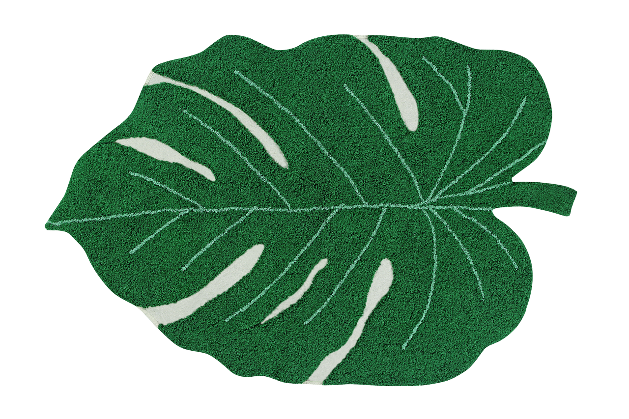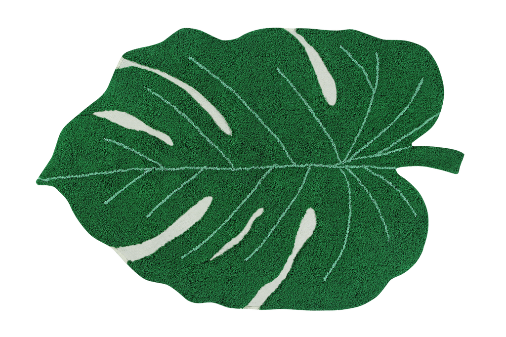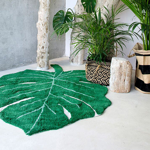 ¡La trendy hoja MONSTERA se convierte en tapete lavable! De la colección Plants, es 100% algodón, lavable en lavadora doméstica (carga 7 kg), tan original que hace del salón o del comedor un espacio original. Moderna y de tendencia... ¡también queda perfecta en una habitación infantil para que niñas y niños jueguen en ella! Segura al utilizar tintes naturales, es ligera por su composición flexible y suave. Hecha a mano por artesanos, es única